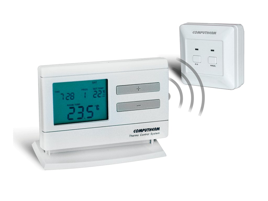 COMPUTHERM Q7RF je moderný programovateľný izbový termostat s bezdrôtovým pripojením, ktorý zabezpečuje spoľahlivú a úspornú reguláciu vykurovania vo vašej domácnosti či kancelárii. Vďaka rádiofrekvenčnému spojeniu medzi termostatom a prijímačom nie je potrebné ťahať žiadne káble – zariadenie môžete jednoducho nainštalovať a ihneď používať. Obe jednotky sú z výroby spárované a vybavené vlastným bezpečnostným kódom pre maximálnu spoľahlivosť a ochranu.